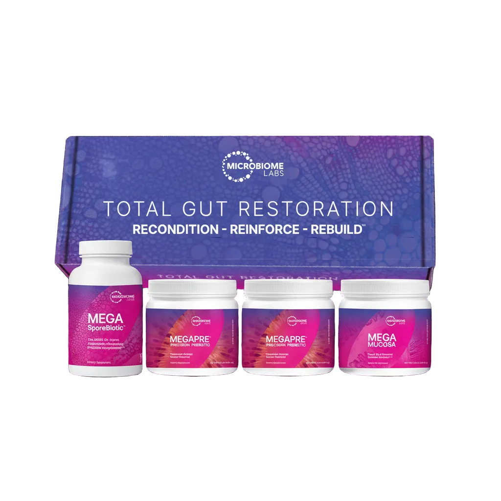 This TGR Kit includes one MegaSpore 180 capsules, two MegaPre powders, and one MegaMucosa powder.